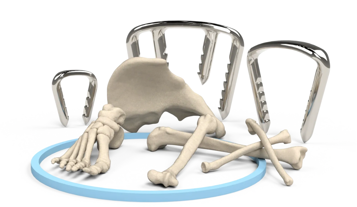 RMR Ortho’s Nitinol implants are available in three families defined by their leg diameters in millimeters (and hence, drill hole size): A'TOMIC™ 2.0 for mini-fragment fixation, A'TOMIC™ 2.7 for small-fragment fixation, and the flagship A'TOMIC™ 3.2 for large-fragment fixation.